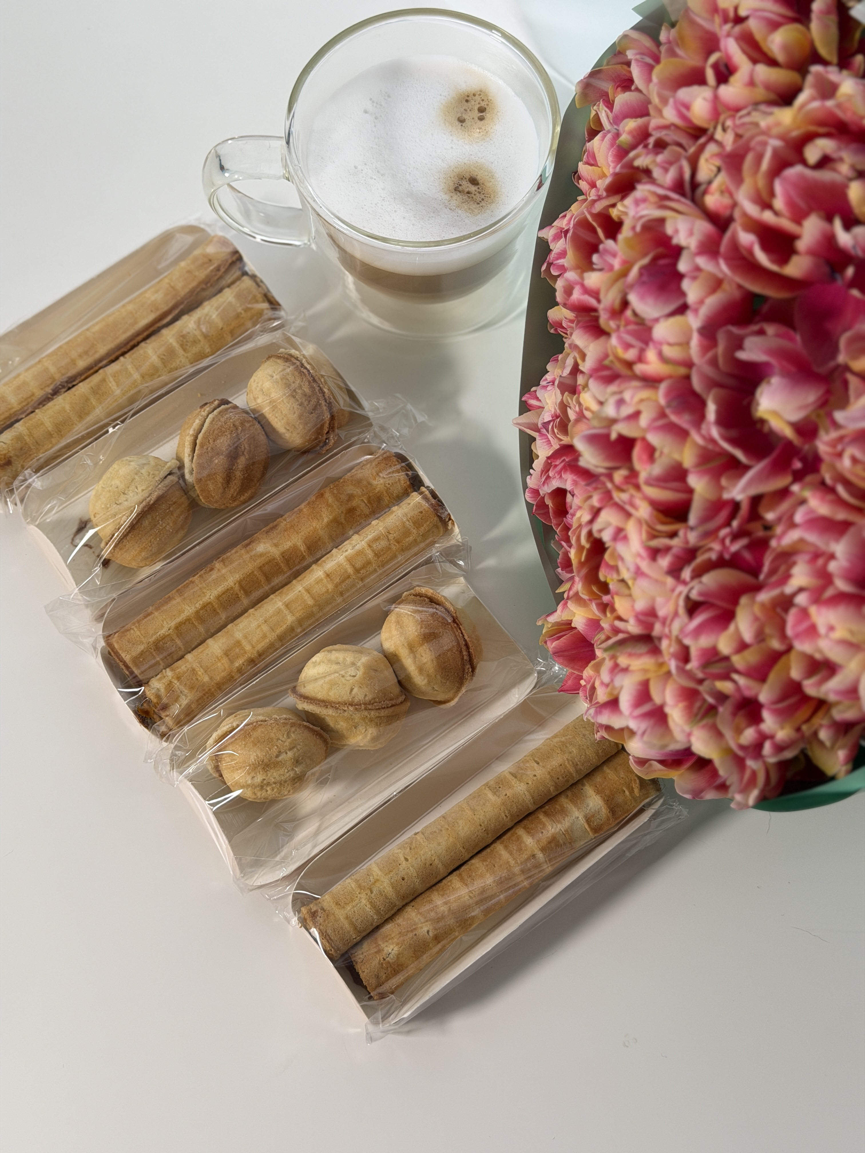 У коробці зібрані хрусткі пісочні горішки та ніжні вафельні трубочки, щедро наповнені вареним згущеним молоком. Ідеальний варіант для подарунка, святкового столу або солодкого компліменту близьким.